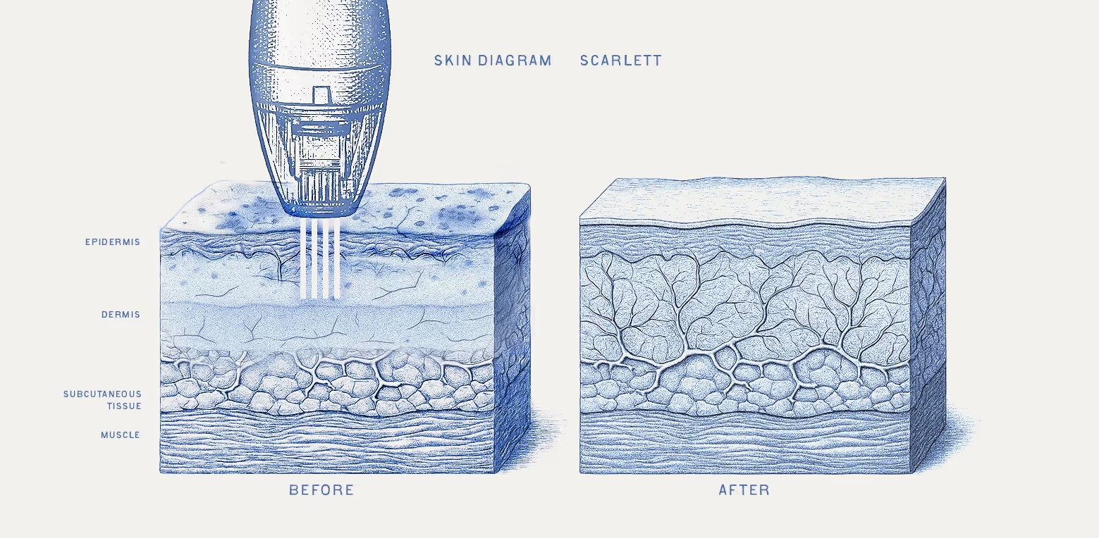 Scarlett RF uses ultrafine microneedles to create tiny channels in the skin while simultaneously delivering radiofrequency energy deep into the tissue. This dual action stimulates collagen and elastin production at multiple levels of the skin. The result? Firmer, smoother skin and a more youthful glow, all with minimal downtime. Over the weeks following treatment, your skin continues to rebuild itself—leaving you with long-lasting, natural-looking improvement.